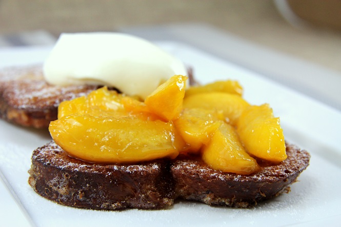 Afunde os pêssegos em água fervente por 30 segundos, retire-os com uma escumadeira e descasque-os assim que esfriarem um pouco. Corte os pêssegos verticalmente em torno do caroço e gire levemente as metades para separa-las, corte as metades em 4 ou em 8 partes, dependendo do tamanho dos pêssegos. Aqueça metade da manteiga em uma frigideira de fundo grosso e coloque os pêssegos, polvilhe com o açúcar de confeiteiro e continue a cozinhar em fogo alto até ficarem bem caramelizados, por cerca de 2 a 3 minutos, transfira as frutas para um prato, mas mantenha-as quente. Seque a frigideira com papel toalha. Despeje os ovos batidos em uma travessa. Aqueça metade do restante da manteiga com uma colher de óleo na frigideira até que a manteiga pare de espumar. Passe as fatias de brioche nos ovos, cobrindo os dois lados. Cozinhe em fogo médio até dourar os dois lados, transfira para um prato aquecido e mantenha quente, repita o processo com as outras fatias de brioche, adicionando mais manteiga e óleo na frigideira. Assim que todas estiverem prontas, acomode-as em pratos, coloque os pêssegos por cima e uma porção de chantilly, polvilhe açúcar de confeiteiro e sirva.